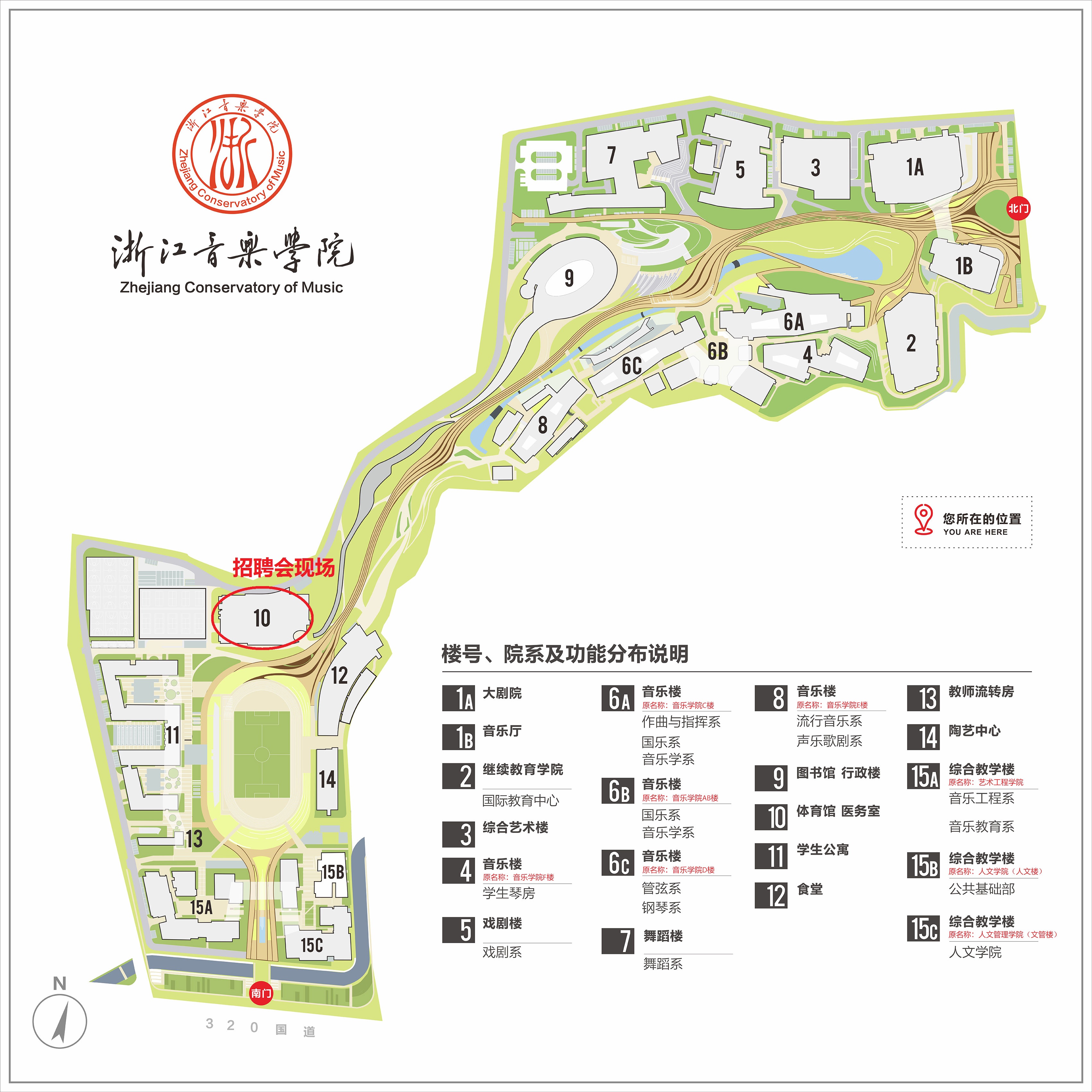 学校坐落于杭州市西湖区之江板块,校园环境优美,设施一流。校园占地面积602亩,校舍建筑面积36万平方米。拥有大剧院1座、音乐厅3座、剧场3个、排练厅102个、琴房906间、录音棚7间以及图书馆、音乐与现代科技实验中心、音乐制作中心等教学辅助和艺术实践场馆。