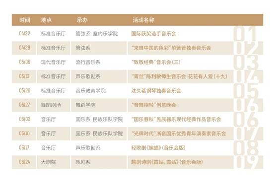 “相约浙音”周末音乐会系列启动后,浙音将在现有演出中优中选优,精心遴选包括声乐、器乐、舞蹈、戏剧等艺术门类的音乐会及演出剧目,在每周五晚上7:30-9:00面向公众上演。届时,校园内的大剧院、音乐厅、标准音乐厅、现代音乐厅、舞蹈剧场、小剧场及黑匣子七大演出场所将轮番上演师生带来的艺术精品。