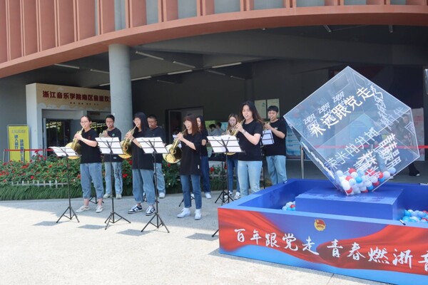 本次活动以百年团史为主线,突出浙音专业优势。当天,浙音学子带来了器乐演奏、诗歌朗诵、音乐思政微课等丰富多彩的活动,第十三届金钟奖得主王博同学演唱了《吊吴淞》。与此同时,浙音还开展了思政社团“青年讲习所”授牌成立仪式。在校园的各个角落,学子们以快闪的形式演绎了原创圆号重奏作品《五四青年风》、原创合唱音乐剧《天黑请闭眼》;学院团委在校园内设置了“青春助力梦想”互动装置,同学们纷纷写下自己的青春誓言。