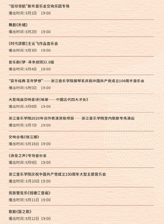 艺术周期间,浙音将首次与网络平台合作开展音乐精品展播活动,集中展现建校以来学院创作的12场大型文艺演出精品,其中包括浙音首部原创歌剧《国之歌》、原创音乐剧《梦·寻李叔同》、原创舞剧《朴裙》等。与此同时,浙音拔尖人才培养机制——叔同学院毕业生音乐会,以及浙音国家艺术基金2020年度艺术人才培养资助计划汇报音乐会也将在浙音校园及浙江音乐厅、杭州运河大剧院上演,市民观众可通过线上线下方式,尽享浙音师生带来的音乐盛宴。