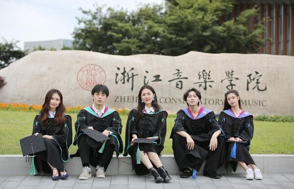 当天,所有毕业生身着浙音设计定制的“中国风”学位服参加毕业典礼、在学校各角落拍照留念。