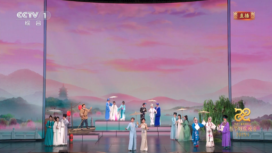 小品《借伞》围绕《白蛇传》中“断桥借伞”的经典桥段,巧妙串联京剧、粤剧、川剧、越剧四个剧种,为观众送上“天下有情人终成眷属”的美好祝福。
