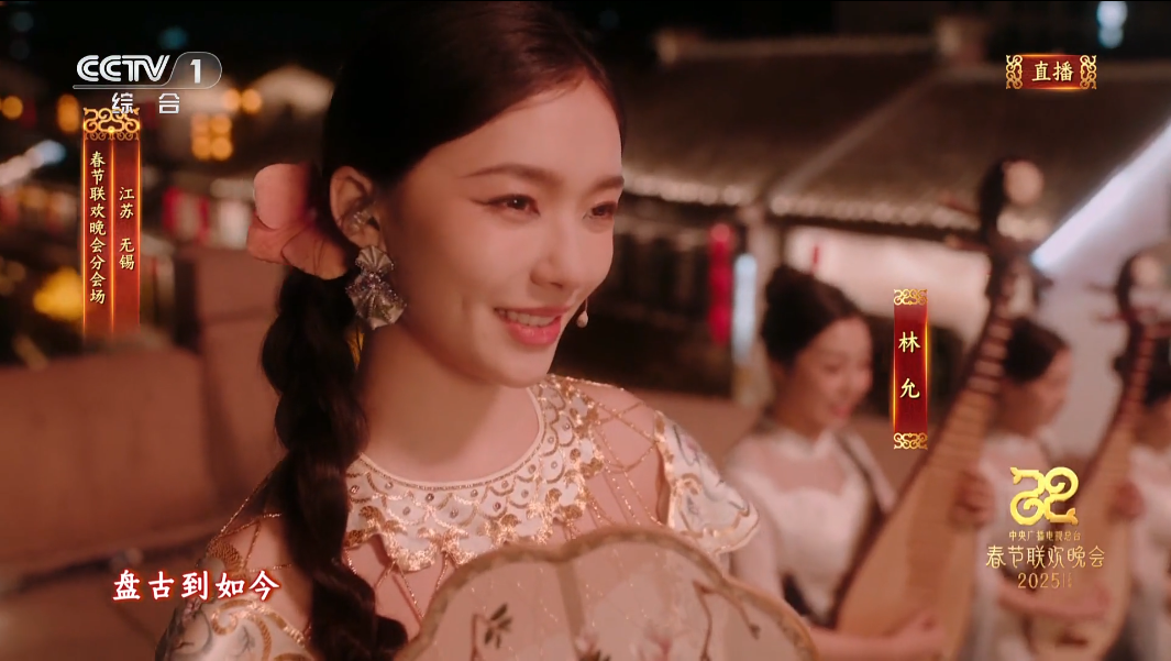 江苏无锡分会场上,湖州姑娘林允现身《无锡景·家国情》,与王劲松、倪妮等人带来表演。