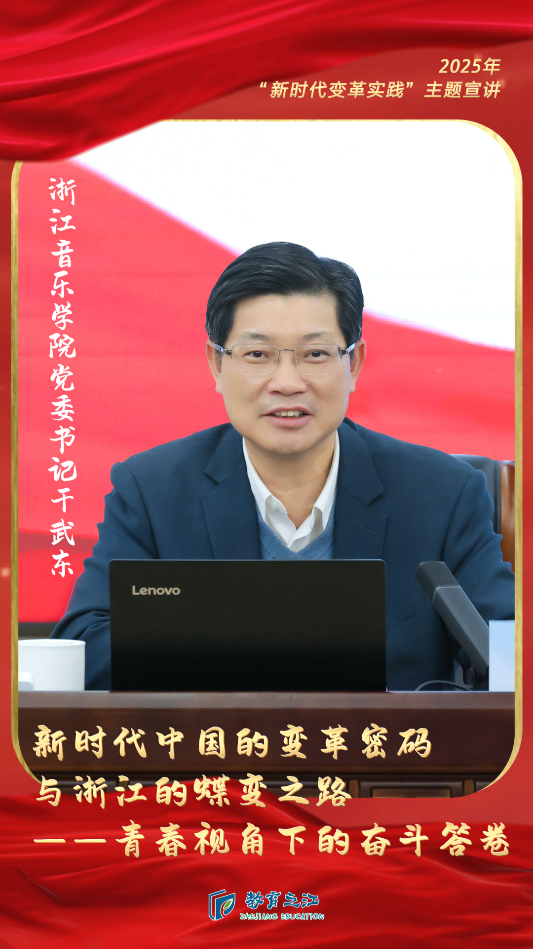 宣讲中,干武东阐述了文化建设“八项工程”实施以来,浙江高标准建成一系列文化地标;推出了一批具有鲜明浙江辨识度、全国影响力的浙产优秀作品;持续加大对公共文化服务的投入力度,扎实推进基本公共文化服务标准化均等化。他还通过介绍浙音和浙音附中组建“文艺轻骑兵”队伍、积极参与公共文化服务的故事,以小见大地让学生了解“八八战略”引领下,浙江如何大力推进文化强省建设。