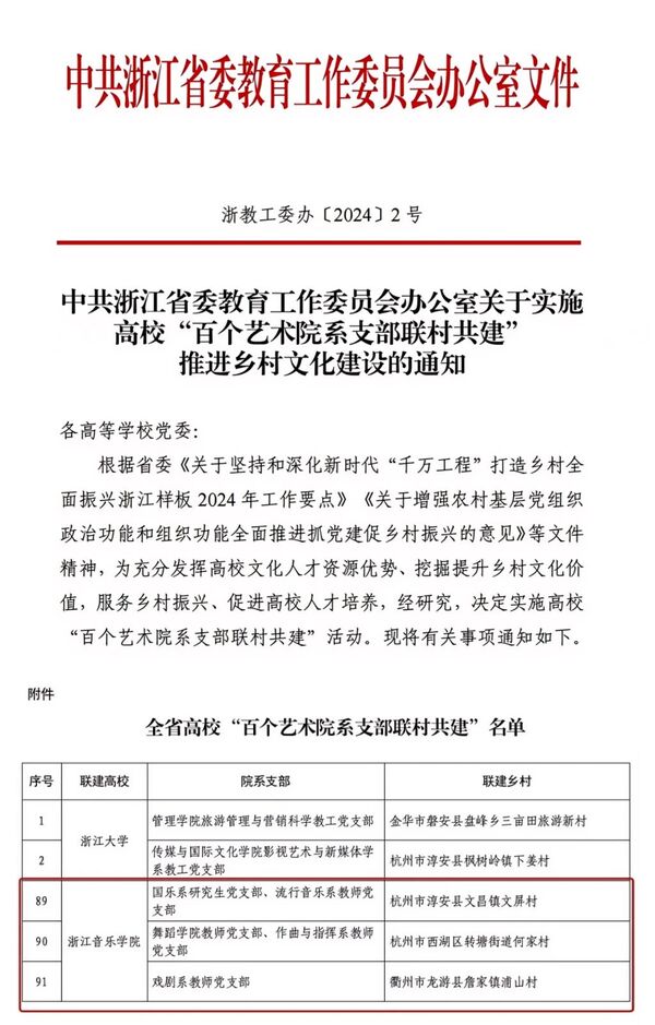 全省高校“百个艺术院系支部联村共建”活动是推动乡村振兴、助力共同富裕的有效路径,也是抓好高校党建“四个融合”工作的重要一环。近年来,我校坚持党建统领作用,充分发挥学科专业、人才和艺术资源优势,已与转塘街道的11个村社、淳安文屏村、龙游浦山村等20余个基层党组织建立长期党建联建关系,其中国乐系研究生党支部、流行音乐系教师党支部、舞蹈学院教师党支部、作曲与指挥系教师党支部、戏剧系教师党支部等5个党支部,与淳安县文屏村、西湖区何家村、龙游县浦山村等3个村的联村共建项目入选全省高校“百个艺术院系支部联村共建”名单,通过组织联建、活动联办、文化联创、人才共育等,精心搭建多元载体,在服务乡村振兴、促进人才培养方面取得了阶段性成果。
