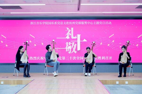 在党建宣传展厅,党员师生集体回顾了习总书记对杭州的深情嘱托和殷切希望,参观学习了杭州在新时代新思想指引下的新实践、新作为、新风采、新成就,以及杭州智慧党建的特色亮点工作。大家在“优秀共产党员”“改革先锋”“最美杭州人”等展区前驻足学习,感受先进人物先进事迹的榜样力量。参观结束后,由国乐系党员师生组成的“文艺轻骑兵”,在党群服务中心表演了吹打乐《庆胜利》、胡琴重奏《我的祖国》、琵琶重奏《唱支山歌给党听》等红色经典乐曲将自己对党的热爱、对伟大祖国的礼赞和对未来的美好向往倾注于音乐,展示了国乐系党建引领与教学改革相互结合的新风貌,赢得了满堂彩。