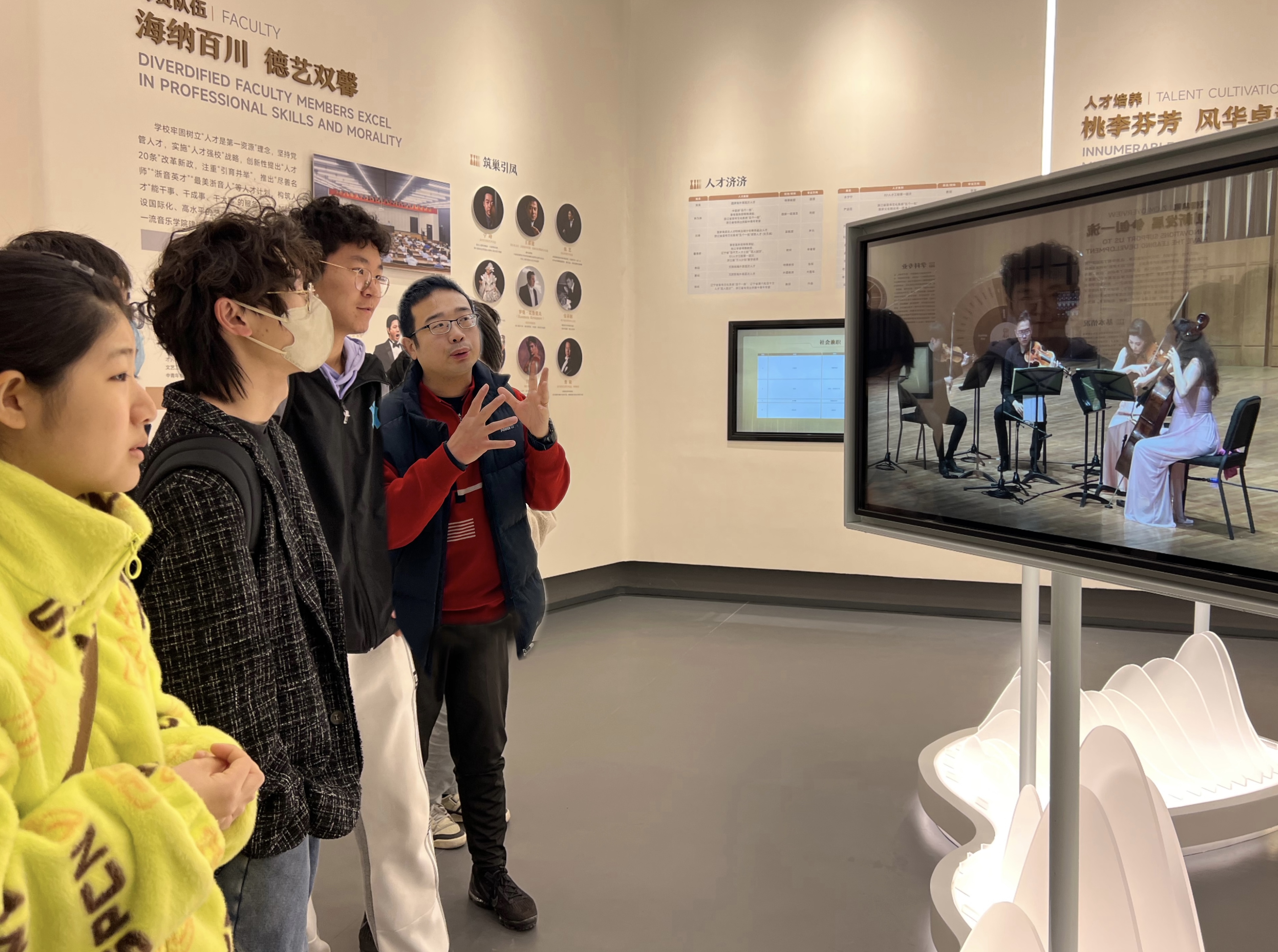 青年教师王海涛结合《习近平新时代中国特色社会主义思想概论》课程中“建设社会主义文化强国”相关内容,带领学生参观了“浙音之窗”展陈。他以亲历者的视角向学生讲述了浙音不平凡的办学历程,引导学生从建设文化强省、建设社会主义文化强国的角度观察浙音发展。当学生看到“浙音之窗”有自己的老师和熟悉作品时,激动之情溢于言表;看到历届优秀毕业生投身家乡建设、创新创业、音乐美育等实践时,仿佛置身于“脱贫攻坚战”“建设美丽乡村”“共同富裕”火热现场。师生们认为,通过观看“浙音之窗”,进一步感知了学院不平凡的发展历程,进一步激发了爱校荣校意识,既是一堂生动的思政课,也是一堂生动的校史校情教育课。马克思主义学院将继续推进教学改革,拓展教学资源,打造实践教学新场景,力争让思政课真正成为学生愿听、想学,学有所思、学有所获、终身受益的“金课”。