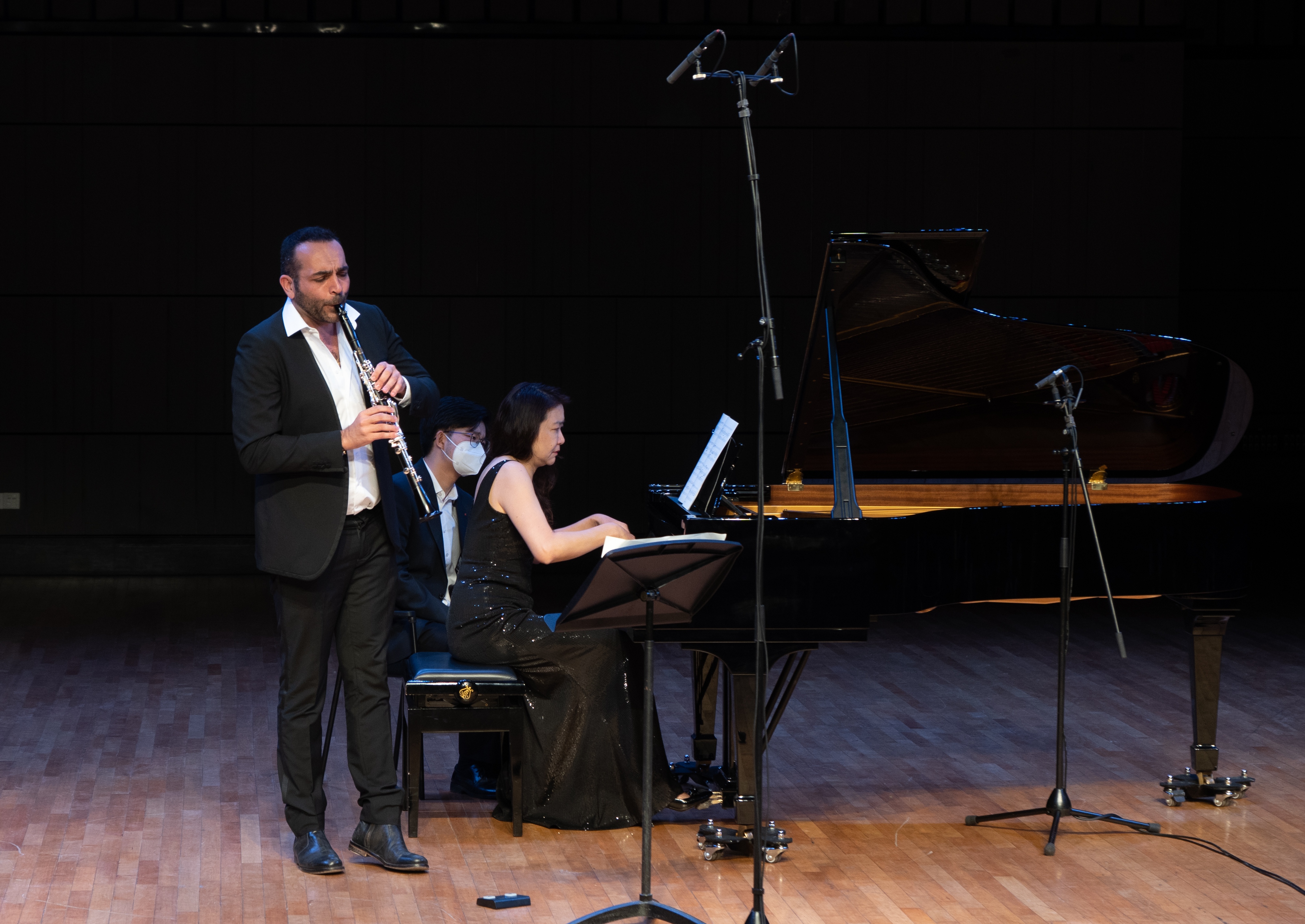 10日晚,皮埃尔·杰尼森单簧管独奏音乐会精彩呈现,现场气氛相当热烈,音乐厅座无虚席。音乐会由皮埃尔与浙音室内乐学院特聘教授史佳怡合作完成。皮埃尔甄选了肖松的《行板与快板》、维多的《引子与回旋》、布列兹的《领域》、普朗克的《奏鸣曲》等最为经典的法国音乐以及德国作曲家勃拉姆斯的《奏鸣曲》op.120,音乐风格跨越浪漫主义中期、新古典主义以及现代派音乐,充分展现了法国音乐的浪漫与迷人和勃氏音乐的诗意和智性。最后,在听众热烈的掌声中,皮埃尔返场加演了意大利作曲家曼加尼为董德君教授谱写的新作《来自中国的旋律》,以及美国作曲家格什温的《三首前奏曲》。两首作品经皮埃尔的生动诠释,给人留下深刻的印象,场上气氛高潮迭起。
