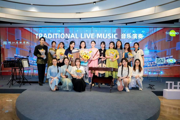 本次活动得到萧山区组织部、萧山人才俱乐部大力支持,同学们将田野调查中的所学所得融入表演,共同呈现了一台精彩的音乐讲演会。大家表演了器乐合奏《花头台》《紫竹调》、古筝独奏《渔舟唱晚》、二胡独奏《良宵》、扬琴独奏《将军令》、中阮独奏《玉楼月》、笛子独奏《欢乐歌》、渔鼓道情《乌鸦与狐狸》《十杯香茶》,以及传统乐器“先锋”展示与声音设计作品《见龙在田》。最后在《紫竹调》欢快的旋律中走向尾声,现场掌声雷动。而演出结束后的互动环节,再次将现场气氛推向高潮,中外嘉宾纷纷上台,争相尝试弹奏民族乐器,同学们手把手进行教授和介绍,讲演会在欢快的交流中圆满结束。