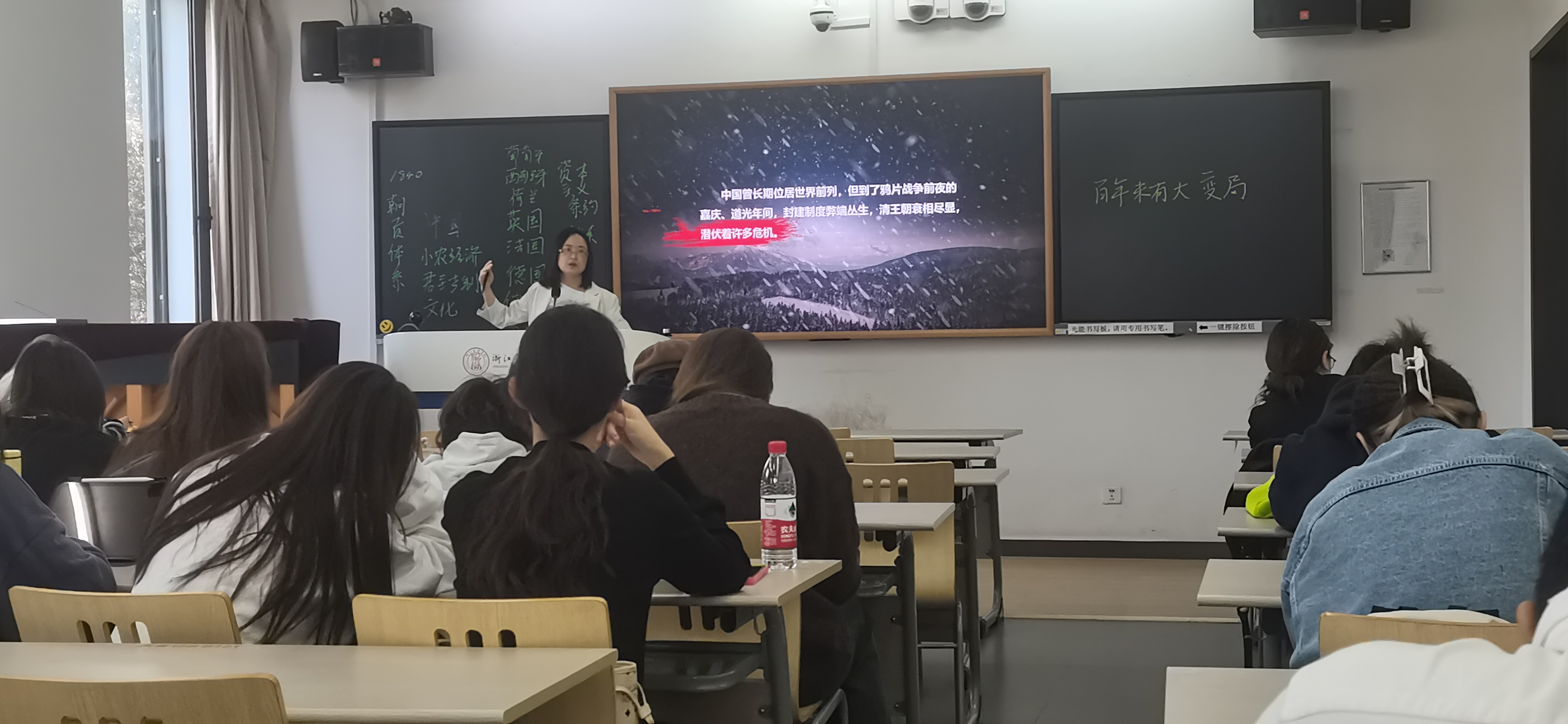 课堂上,马克思主义学院教师何宛昱聚焦近代中国历经的磨难与开展的抗争,通过生动细致的讲解,引导学生在学习和讨论中树立正确的历史观。