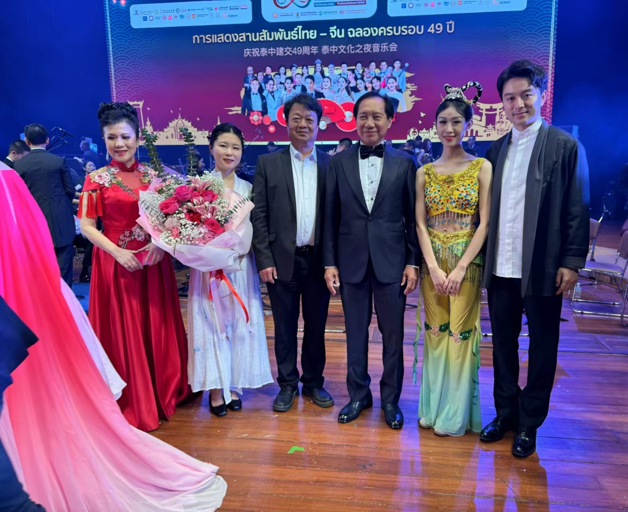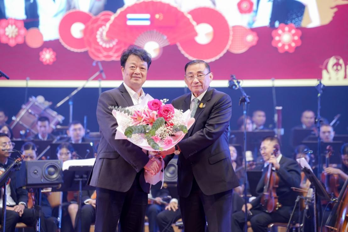 此次,中泰演奏家同台,联袂奉献了一场热情洋溢的精彩演出,通过音乐、歌曲、舞蹈,以及创意“音画舞”等多种形式的演绎,在舞台上呈现出中泰文化交流互鉴、交融相映、美美与共的和谐画面。学院三位教师以专业性及新颖的艺术呈现,受到中国大使馆、泰国文化部及主办单位的高度赞扬与观众的一致好评,泰国文化部长森萨给沈纳蔺老师献花。