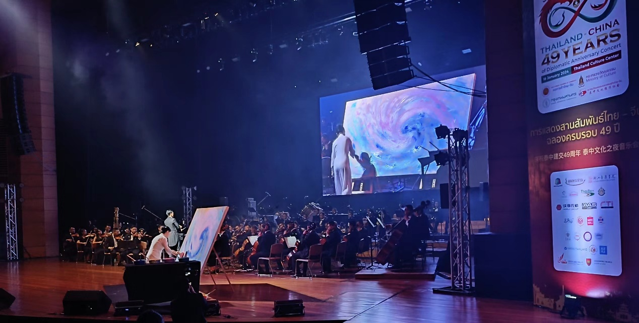 音乐会上,李跞演奏了由著名作曲家王丹红作曲的琵琶协奏曲《云想花想》,少将纳荣指挥泰国皇家海军交响乐团协奏;李秋竹表演中国古典舞《飞天》,与大屏幕展示的浙音学子音乐-绘画作品相得益彰、静动有致;交响乐团弦乐队首演了沈纳蔺为弦乐队而作的《下四川》,由画家张晓丽现场创作音乐-绘画,该同名画作赠予泰国文化部收藏。演出结束后,中泰方嘉宾上台向学院教师等表演者致谢,并互致新春祝福,祝愿两国未来更加美好、稳定、繁荣。