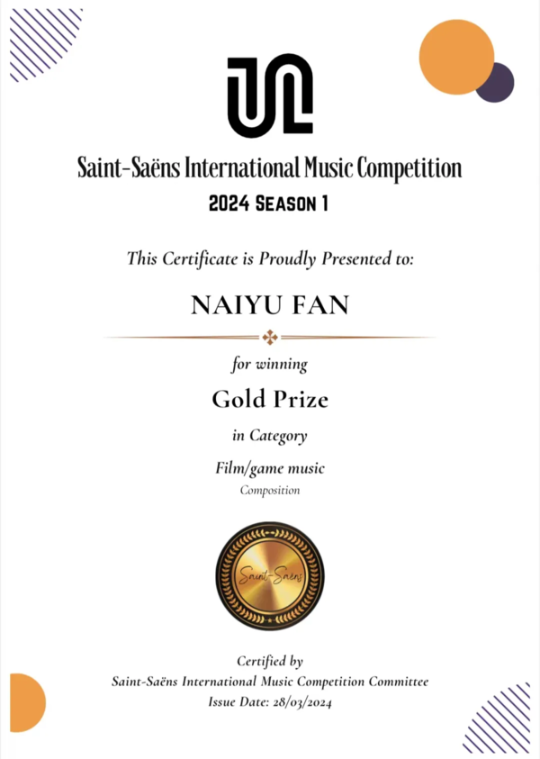 近日,圣桑国际音乐比赛公布大赛成绩,音乐工程系2021级音乐设计与制作专业学生范乃予作品《Winter has gone》在众多参赛作品中脱颖而出,荣获电影/游戏音乐组金奖,该作品由杨磊副教授指导。