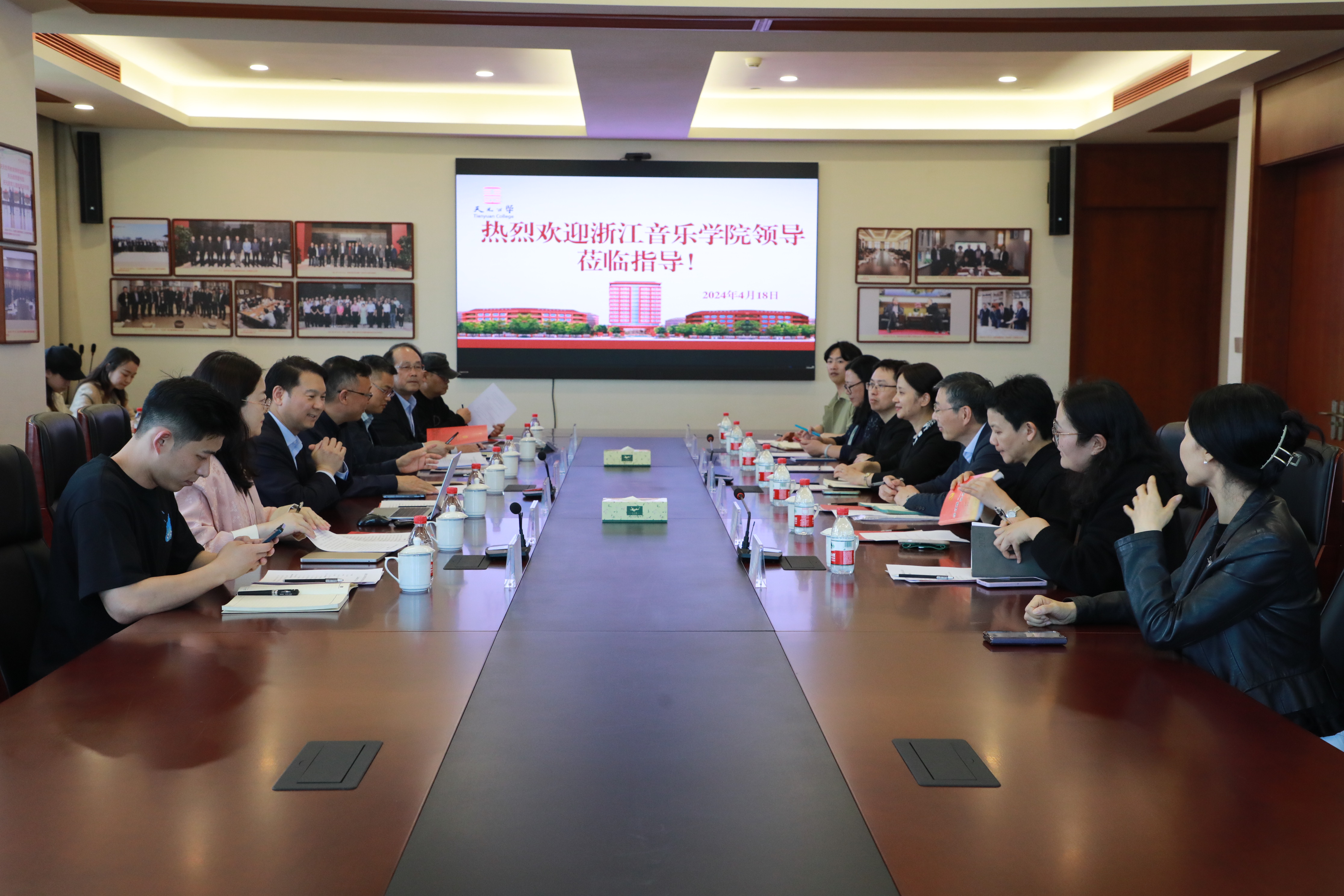 蔡亦军介绍了我校的整体发展、办学特色、师资力量、标志性成果等,学校坚持以高起点规划、高标准建设、高水平办学、高质量发展的“四高”标准进行办学,其办学理念和天元公学有很高的契合度,希望未来在学生人才培养、师资队伍建设、实习实践基地、科教融合发展、学生就业等进一步深度交流合作,加强学生综合素质的交流与培养,以访企拓岗为契机,进一步在共建实习实践基地、音乐舞蹈专业教学、党建共建、社会合作等方面进行多方位长期深度的合作交流,共同促进校级双方高质量发展。随后,音教学院、舞蹈学院、招生办负责人也分别介绍了各自的专业特色、学生发展、毕业生情况、招生情况等。