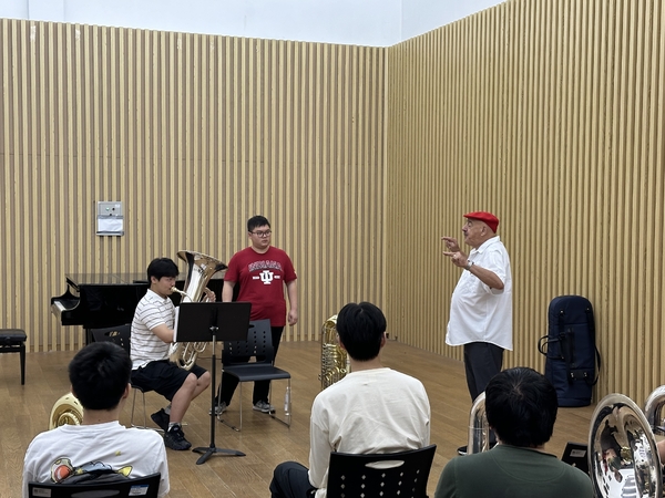 5月31日上午,佩兰托尼教授大号大师班在管弦系C109排练厅举行,我校21级孙祺洋,22级许合鑫,附中高二年级朱思宇同学分别上台接受佩兰托尼教授的指导。尽管教授已83岁高龄,仍带领全体同学进行基本练习,并亲自示范演奏技巧,一丝不苟地回答同学的问题,使现场受众叹为观止。此次大师班还吸引了长三角地区的师生们前来参加,教授的教学理念使在场师生受益匪浅,伴随着师生热情的欢呼和热烈的掌声,佩兰托尼教授此次浙音之行圆满落幕。