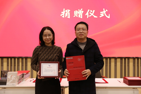 学院教师代表向浙江图书馆捐赠了由艺术指导教学部教师出版的系列书籍和音像制品。浙江图书馆毛炳聪主任代表浙图向浙音教师代表颁发了捐赠荣誉证书。