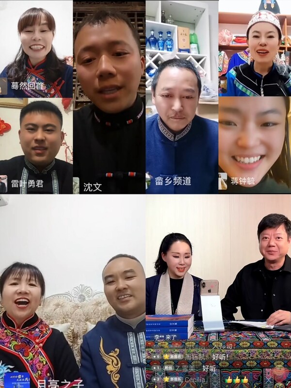 直播的任意门让各地传承人汇聚一堂,线上的即刻互动更是未知而令人期待。这次直播就惊喜连线到大洋彼岸就职于悉尼音乐学院的青年作曲人蒋钟毓,她曾为洪艳整理改编的畲族古歌《叮当梆》编配人声与乐队版,该作品曾在首届畲族音乐文化研究学术研讨会音乐展演中以男女二重唱和乐队合作的形式亮相。同时,直播间也临时邀请到乐典演艺公司詹雪军老师与洪艳共同再现了这部中西合璧的畲歌新时代作品,为这场畲歌盛宴画上闪亮的句号。