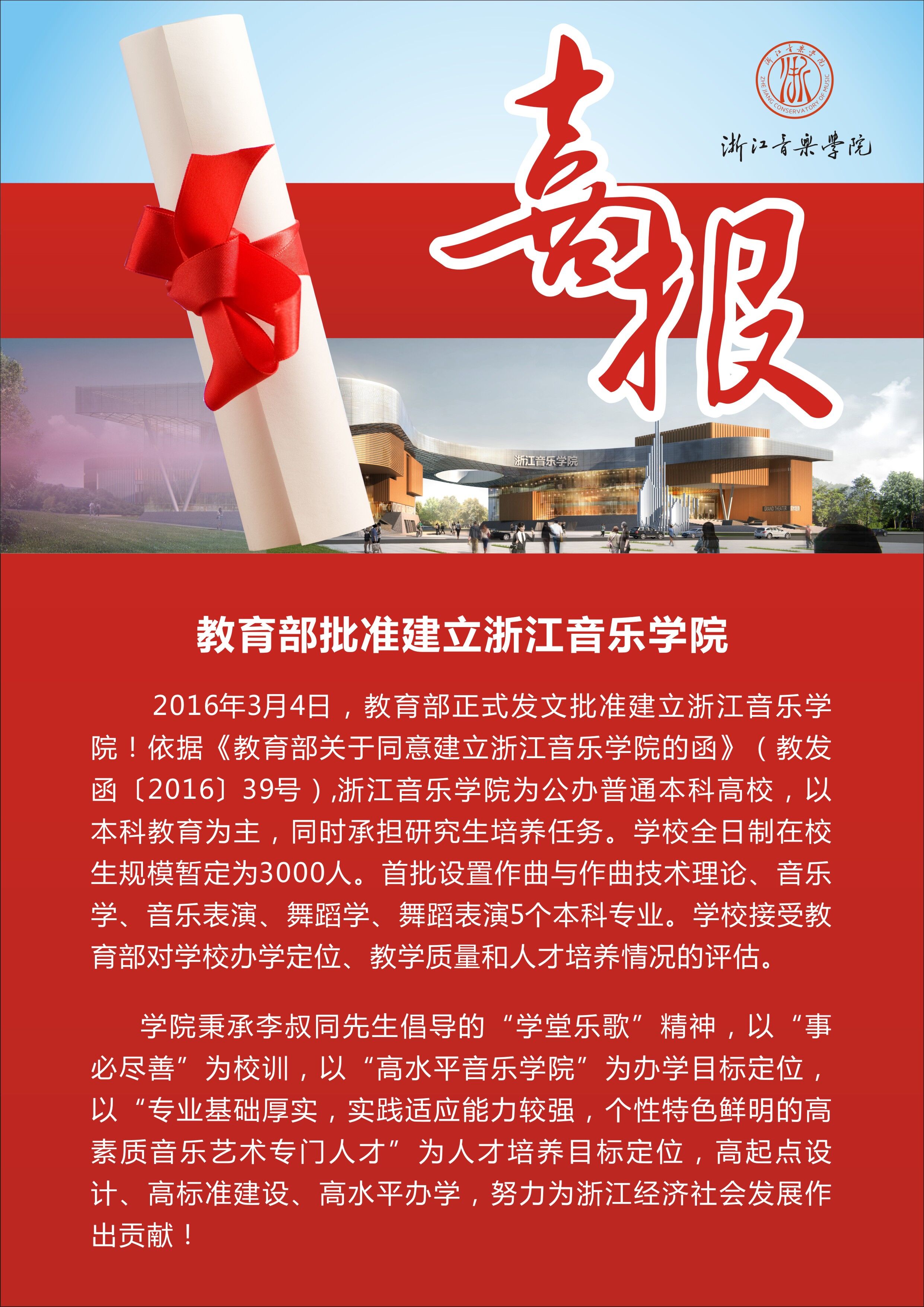 学院秉承李叔同先生倡导的“学堂乐歌”精神,以“事必尽善”为校训,以“高水平音乐学院”为办学目标定位,以“专业基础厚实,实践适应能力较强,个性特色鲜明的高素质音乐艺术专门人才”为人才培养目标定位,高起点设计、高标准建设、高水平办学,努力为浙江经济社会发展作出贡献!