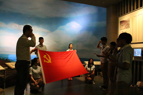 在纪念馆伟人壁画像前,学生党员代表向着党旗,举起右手重温入党誓词。庄严的画面、豪迈的誓言使每一位党员仿佛回到了入党的那一刻,又一次接受心灵的洗礼,进一步坚定了立场信念。
