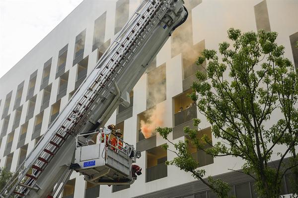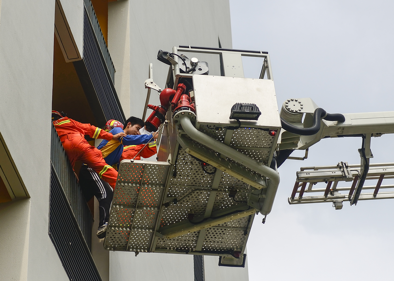 演练现场,教师流转房四楼烟雾弥漫,公寓管理员发现后迅速拨打校园110,校园110接警后立即拨打119并启动应急预案,上报学院领导,同时通知学院保卫处消防应急分队赶往火灾现场。学院领导接报后,第一时间赶赴现场,设立临时指挥部,在消防部门赶到之前,指挥学院消防应急分队开展疏散与自救工作。救火抢险组和疏散引导组迅速冲进楼内组织人员疏散逃离;安全救护组、现场警戒组和后勤保障组各司其职,在场外组织开展封锁和救援行动。消防部门接警后,立即出动A类泡沫车、奔驰水罐车、32米高喷车、32米登高车赶赴现场。到达火灾现场后,消防队员第一时间对主楼四楼及以上楼层人员沿疏散楼梯疏散至安全区域,高喷车展开打击火势,登高车通过阳台对被困人员进行救援。