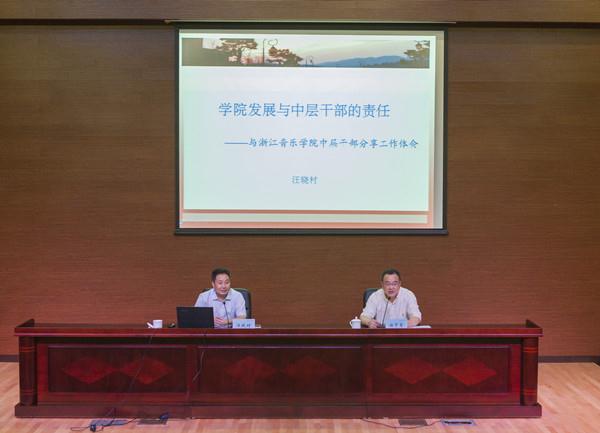 褚子育在总结中指出,汪晓村结合个人多年领导岗位和干部管理工作经验,对学院中层干部如何充分发挥中坚作用、全面履行岗位职责提出了具体明确的要求。希望大家认真学习,深入实践,开拓创新,锐意进取,时刻把学校的事业放在心上,踏踏实实干好本职工作,建设一流高水平音乐学院努力奋斗。