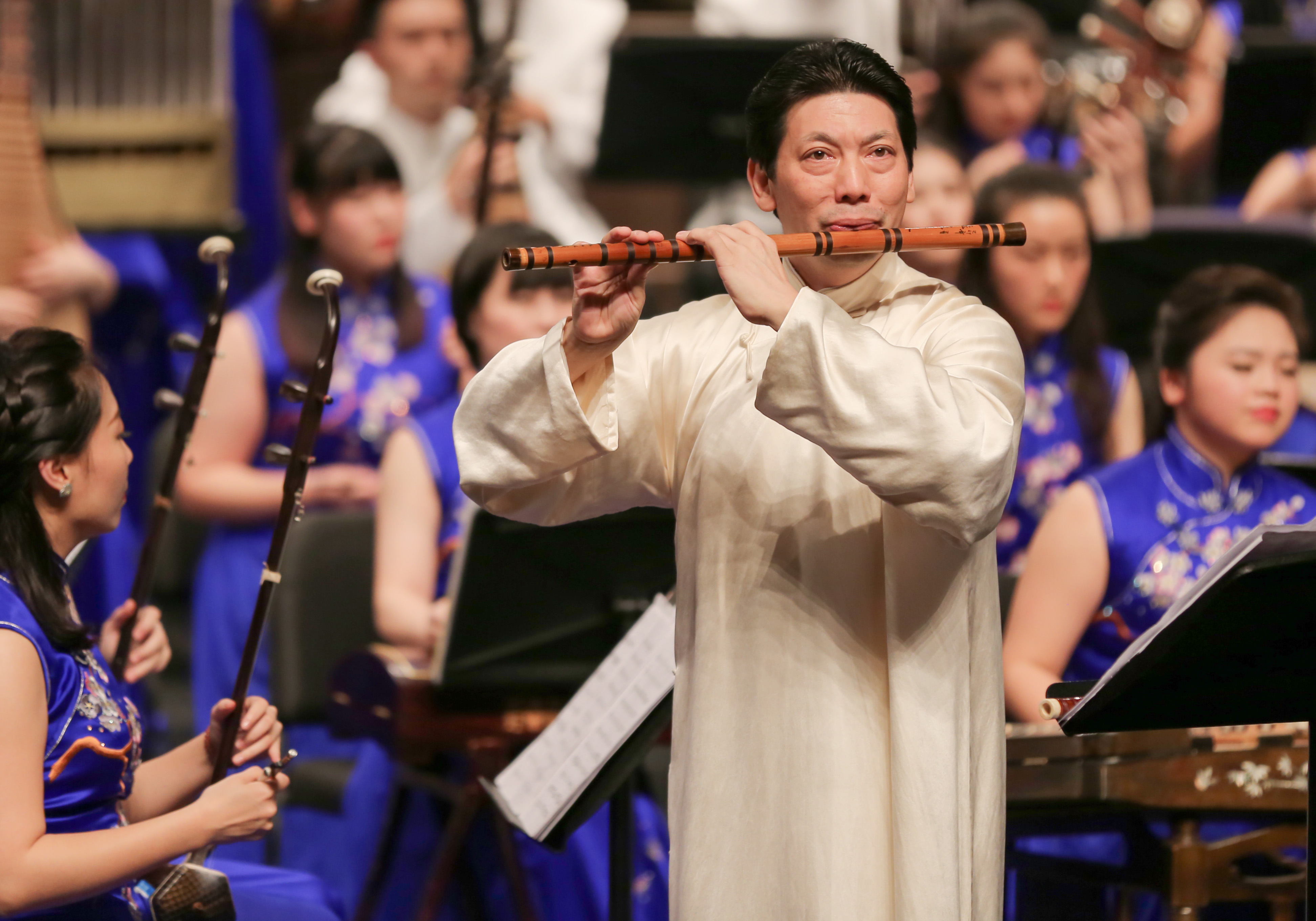 灯光集聚在舞台上,乐队以一曲充满民族特色的《渔舟凯歌》拉开序幕,国乐团一演奏,观众便被这音乐氛围所吸引。《瑶族舞曲》以当地传统歌舞鼓乐为素材创作,在国乐团的演奏下,丰富、生动地展现了瑶族民众欢歌热舞的喜庆场面,表现了能歌善舞的瑶族人民的生活情貌。金钟奖金奖得主刘乐与王琦携手献上古筝二重奏《高山流水》。曲目描绘了流水的各种动态,抒发了志在流水,智者乐水之意,尾声情越的泛音,使人们沉浸于“洋洋乎,诚古调之希声者乎”之思绪中。现场,刘乐还用日本明治时期制作的十三弦筝,演奏了日本民谣《樱花》,静心品听筝的韵味,一副“花如云海似采霞,芬芳无比美如画”的景象浮现脑海。金钟奖优秀奖得主焦点在杨磊的笙伴奏下,演绎了唢呐经典名曲《百鸟朝凤》。曲目以热情欢快的旋律与百鸟和鸣之声,表现了生气勃勃的大自然景象。现场喜悦气氛浓烈,百鸟朝凤般热闹的场景浮现在观众眼帘。
