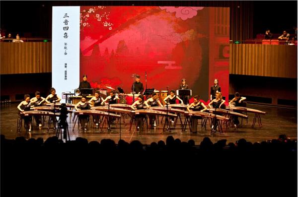 锣鼓喧天,筝乐欢腾。15把古筝配以锣、鼓等打击乐器同时奏响,让观众立刻感受到中国民俗音乐的精彩和魅力。下半场,第一首乐曲《三音四喜》是新民俗音乐对于中国民族器乐音乐在传统民间音乐上的继承、发展和创新,它融入了新音乐手段和语言,是一部古筝四重奏作品,旨在表现中国传统文化观念中久旱逢甘露、他乡遇故知、洞房花烛夜、金榜题名时的的人生四大喜事。《丝路·花语》是一首颇具流行风格的古筝、中阮、打击乐、钢琴合奏作品,通过将两把筝分别定出两个不同音阶,仿佛将人们带入了那个异域风情的花香细语之中。马来西亚作曲家钟启荣先生的作品《涌现的四季》,专为古筝四重奏、大阮、低音提琴和二位打击乐手而创作,翡翠筝团用诸多全新的音乐元素,如弓弦拉动古筝、水管甩动、用手指转动水杯等一系列音响声效,展现了一幅多彩的四季景象,动情的演奏让听众耳目一新。