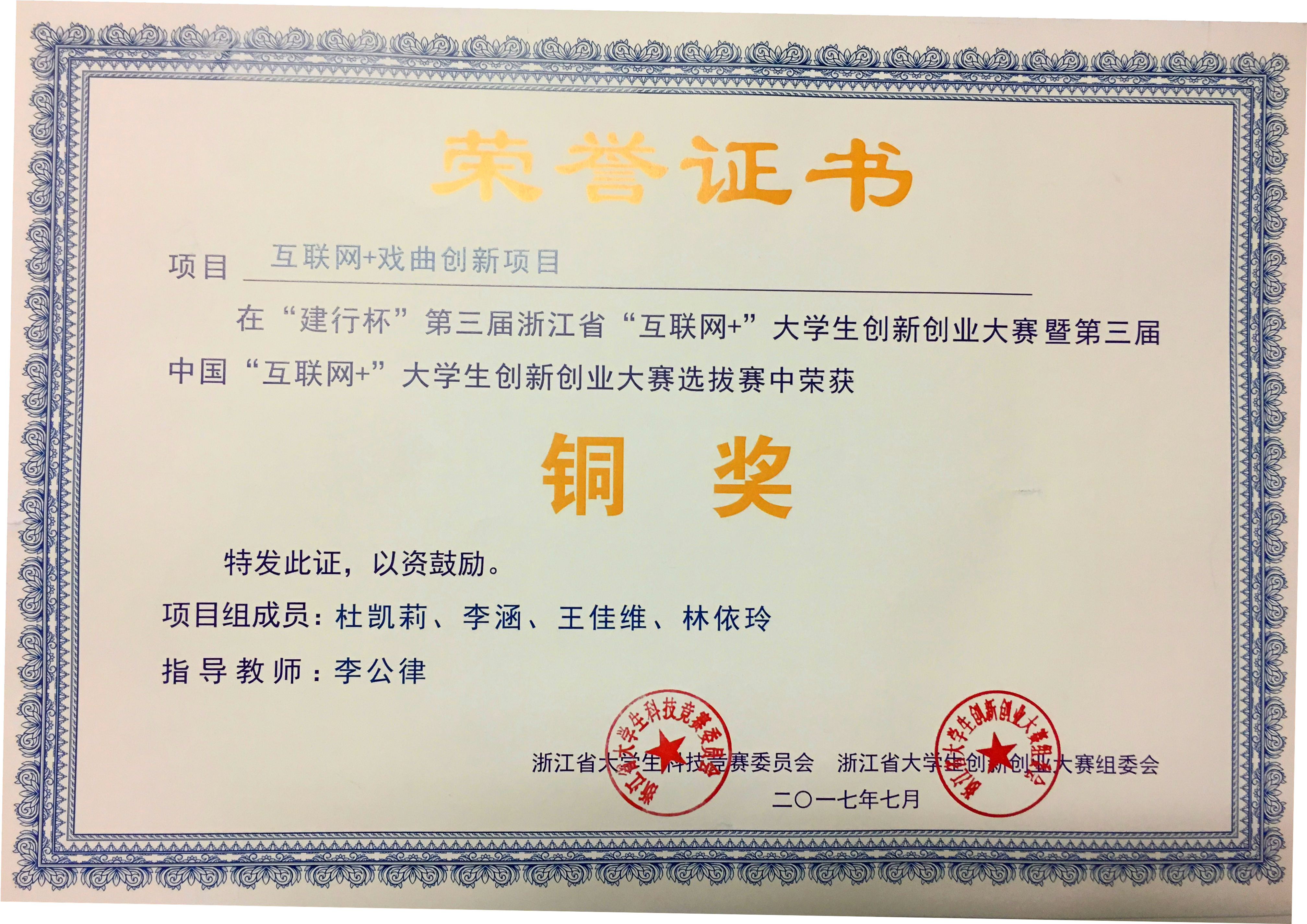近日,第三届浙江省“互联网+”大学生创新创业大赛圆满落下帷幕,我院戏剧系学生杜凯丽参与“互联网+戏曲创新项目”摘得铜奖。