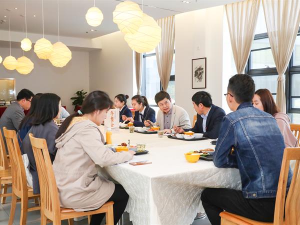 4月17日中午,由学院党委学工部组织的“院领导与学生午餐会”活动在北区食堂举行。学院党委副书记、副院长张建国,学院党政办、学工部、教务处及乐典文化有限责任公司等有关部门负责人,与10余位同学围坐在一起共进午餐。
