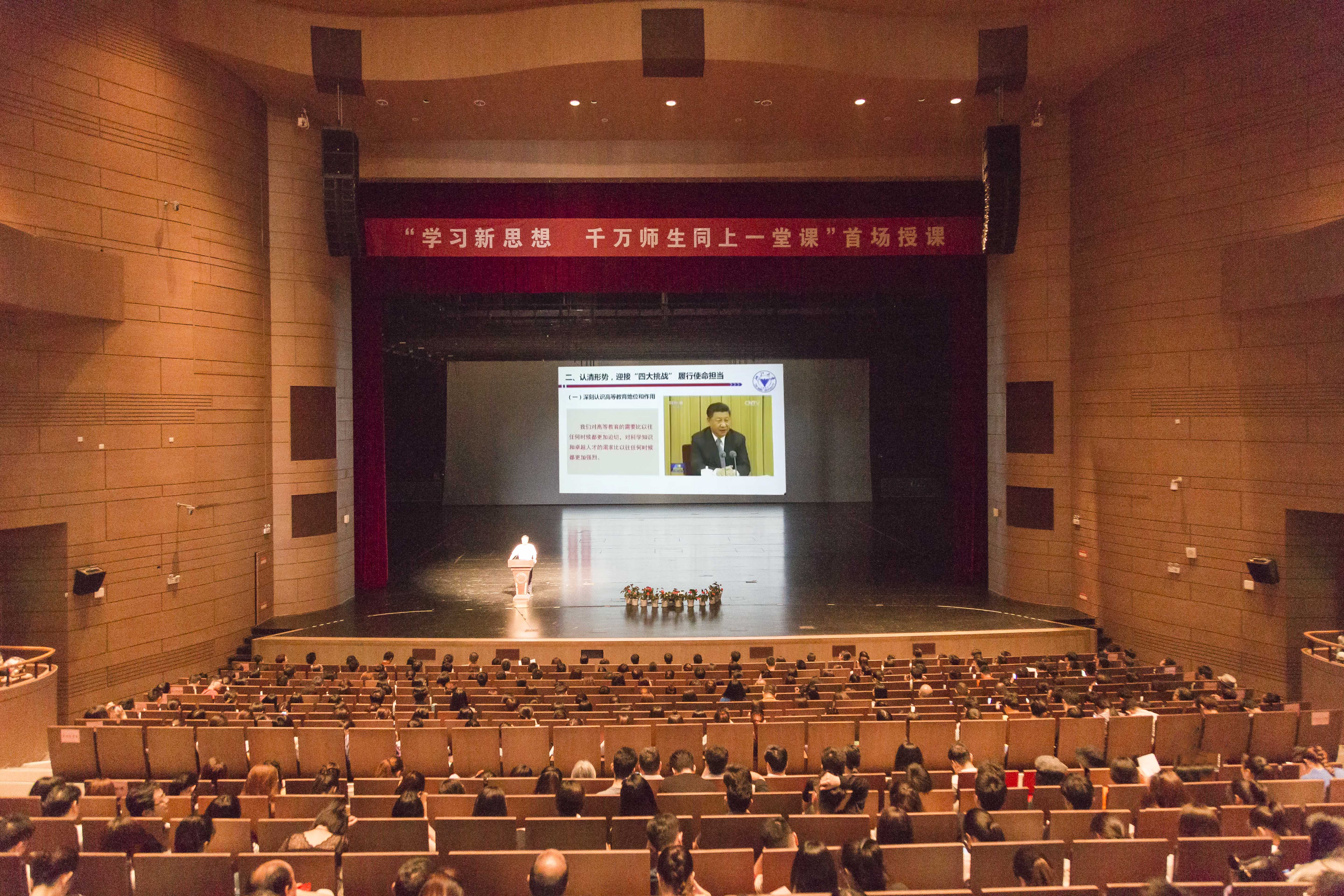 授课中,张彦教授以《擦亮底色,彰显本色——做新时代马克思主义的传承者、捍卫者和践行者》为题作了精彩授课。她结合马克思诞辰200周年和《共产党宣言》发表170周年,从学习马克思经典理论上“回到马克思”、在辨明马克思主义上“走近马克思”、在践行习近平新时代中国特色社会主义思想上“发展马克思”三方面,鼓励师生要勇于担当,做当代中国马克思主义的传承者、捍卫者和践行者。邬小撑部长以《学习新思想,引领新时代——育挫万籁于笔端之才》为题,着力从“坚定信心,从‘三个意味着’看中国高教”“认清形势,迎接‘四大挑战’履行使命担当”“统筹规划,突出主体性推进学生的全面发展”三方面,深刻阐释了坚持以习近平新时代中国特色社会主义思想为指导,聚焦三项基础性工作, 以立德树人为根本,努力培养德智体美全面发展的社会主义建设者和接班人。两位专家的报告围绕习近平总书记重要讲话精神,紧密联系教育工作和师生思想实际,解读有理有据,论述深入浅出,阐述生动深刻,坚持问题导向,注重把握时代发展脉搏,引起现场师生强烈共鸣,大剧院里不时响起阵阵热烈的掌声。