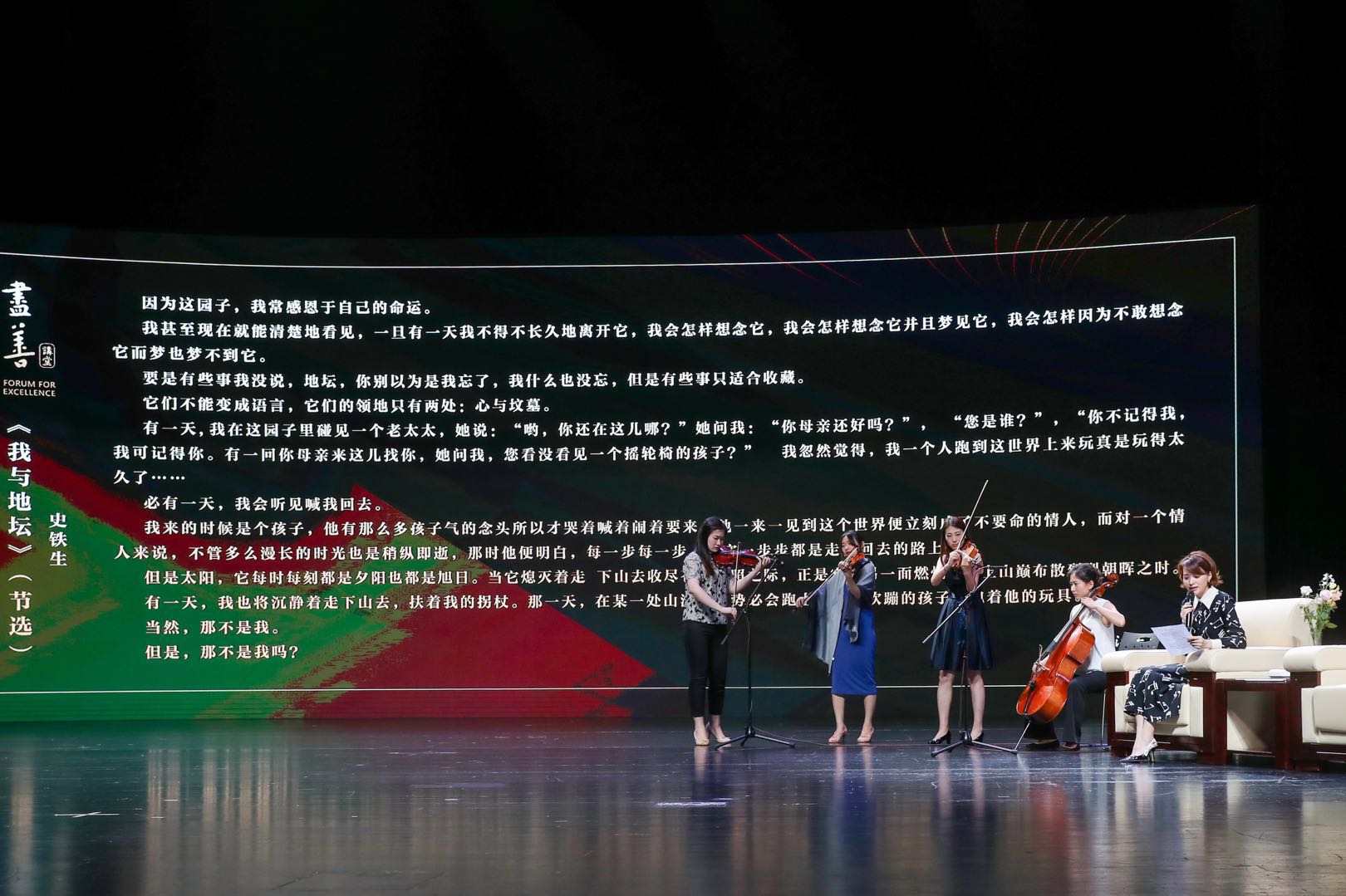 董卿老师与现场师生观众进行的面对面互动交流也成为当晚的一大亮点。师生们分别就“《朗读者》对经典文化传承的影响”“《朗读者》配乐的选取”等问题纷纷向董卿老师提问和请教,董卿以睿智幽默的语言一一作了精彩的解答。在最后的互动环节,董卿秒变“朗读者”,与学院管弦系弦乐四重奏的四位演奏家现场配乐,朗读了一段中国当代作家史铁生的长篇哲思抒情散文《我与地坛》。在现场师生观众雷鸣般的掌声中,“尽善讲堂”第一讲圆满落下帷幕。