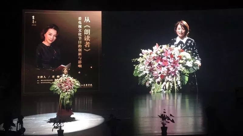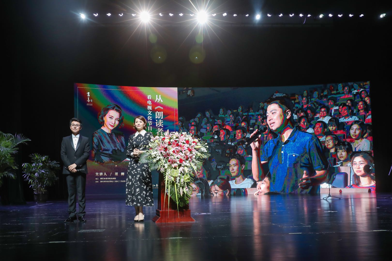 在现场观众雷鸣般的掌声中,董卿老师特意穿了一条音符印花的连衣裙走入讲堂,以“从《朗读者》看电视文化节目的创新与影响”为题,用自己深邃的思想及开阔的艺术视野,从 “文化类节目的天时地利”“文化类节目的创新破局”“文化类节目的影响力”等三个方面,分享了她与中央电视台推出的大型文化情感类节目《朗读者》的故事,将观众带回了朗读的时代,深挖阅读的意义,引起了师生观众们强烈的共鸣。