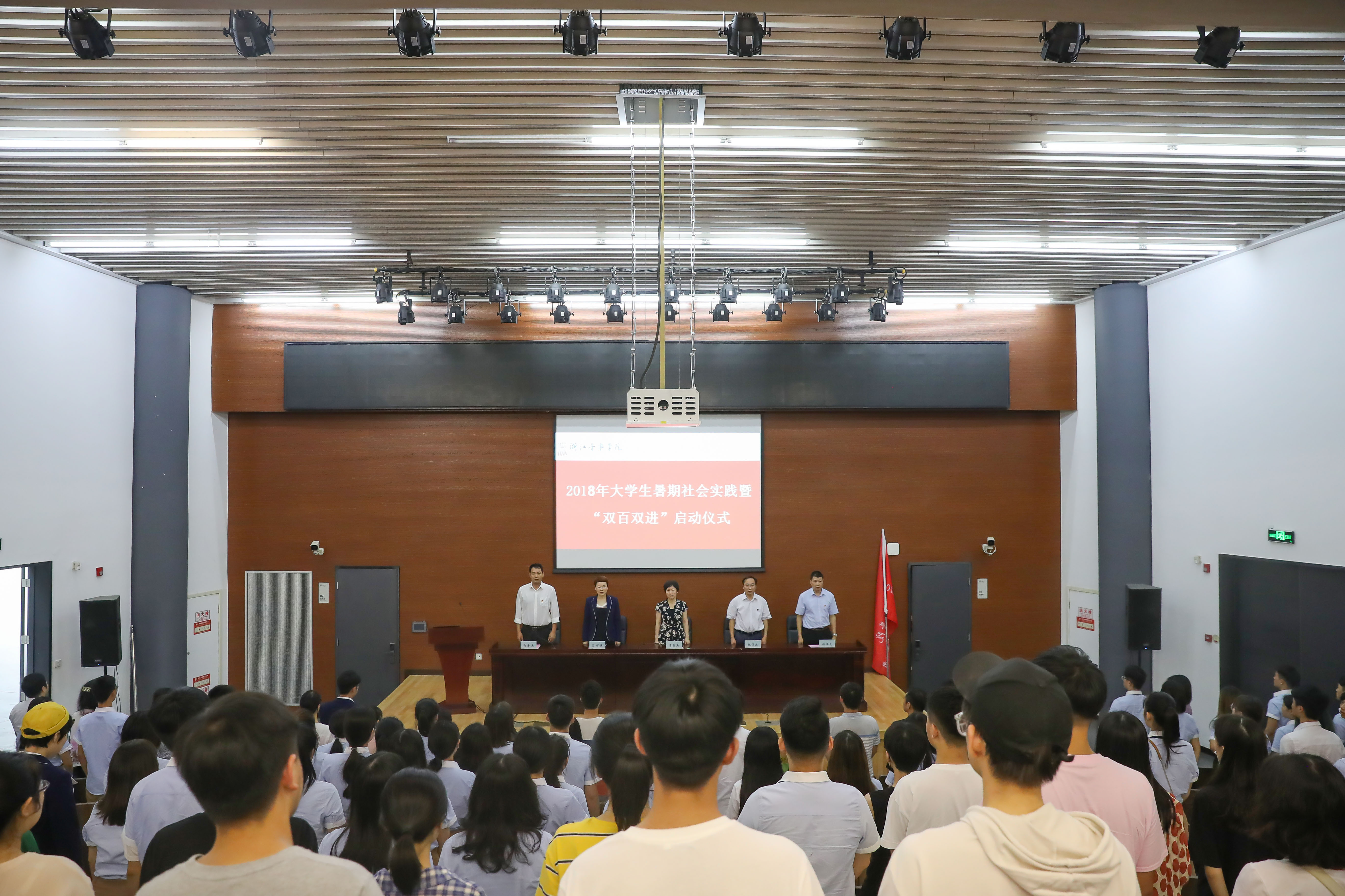 7月6日下午,学院2018年大学生暑期社会实践暨“双百双进”活动启动仪式在学术报告厅举行,学院党委副书记贾秀英,党委组织部、党委宣传部、党委学工部、团委负责人及参加社会实践的师生代表共200余人参加。