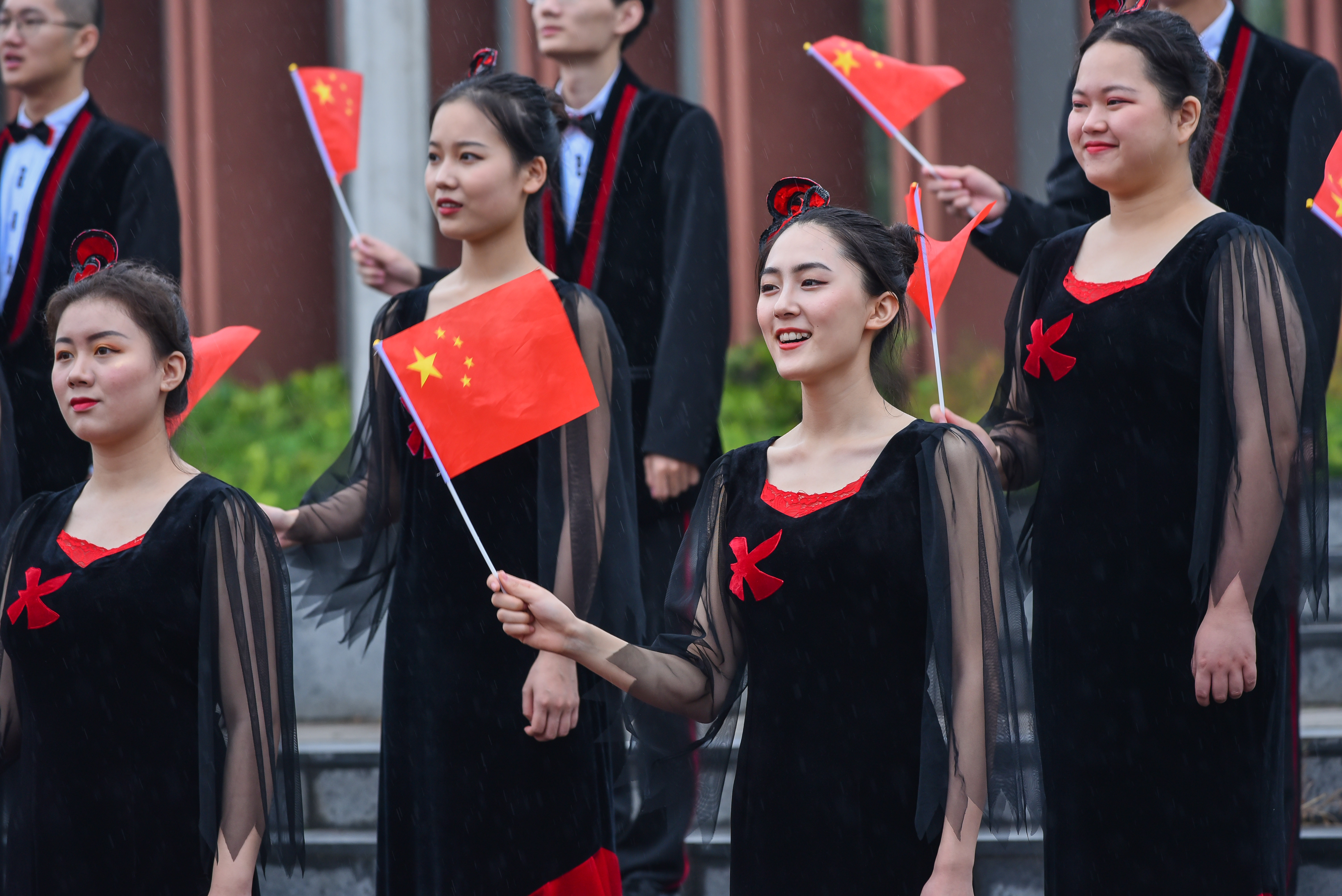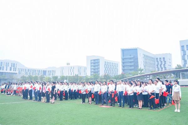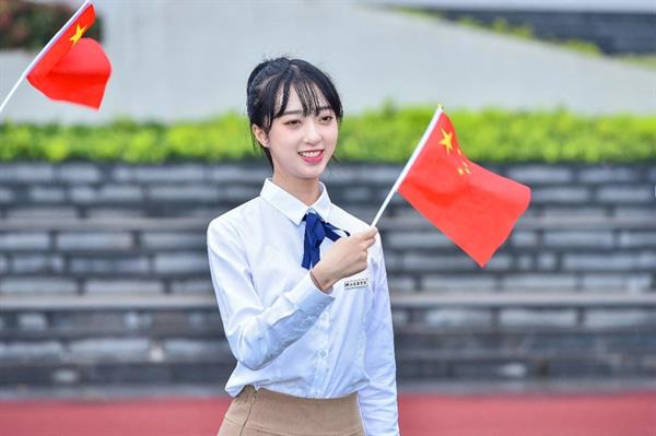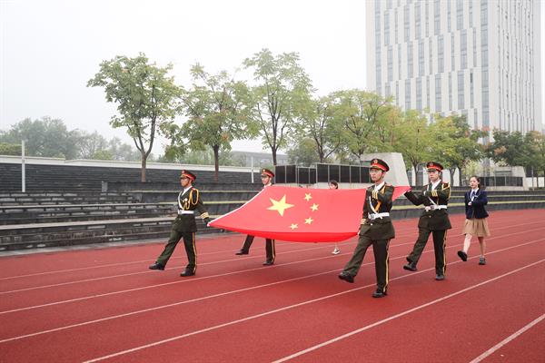 上午8时,师生们冒雨在操场隆重举行升旗仪式。国旗护卫队队员们迈着整齐划一的步伐,将国旗护送至升旗台,师生员工肃立注目。在庄严的国歌声中,鲜艳的五星红旗冉冉升起,大家满怀崇敬之情向国旗行注目礼,送上对祖国最美好的祝福。升旗仪式结束后,还举行了“祝福祖国”校园快闪,大家挥舞手中的国旗,以歌言志,以艺抒情,表达对伟大祖国最深情的热爱。