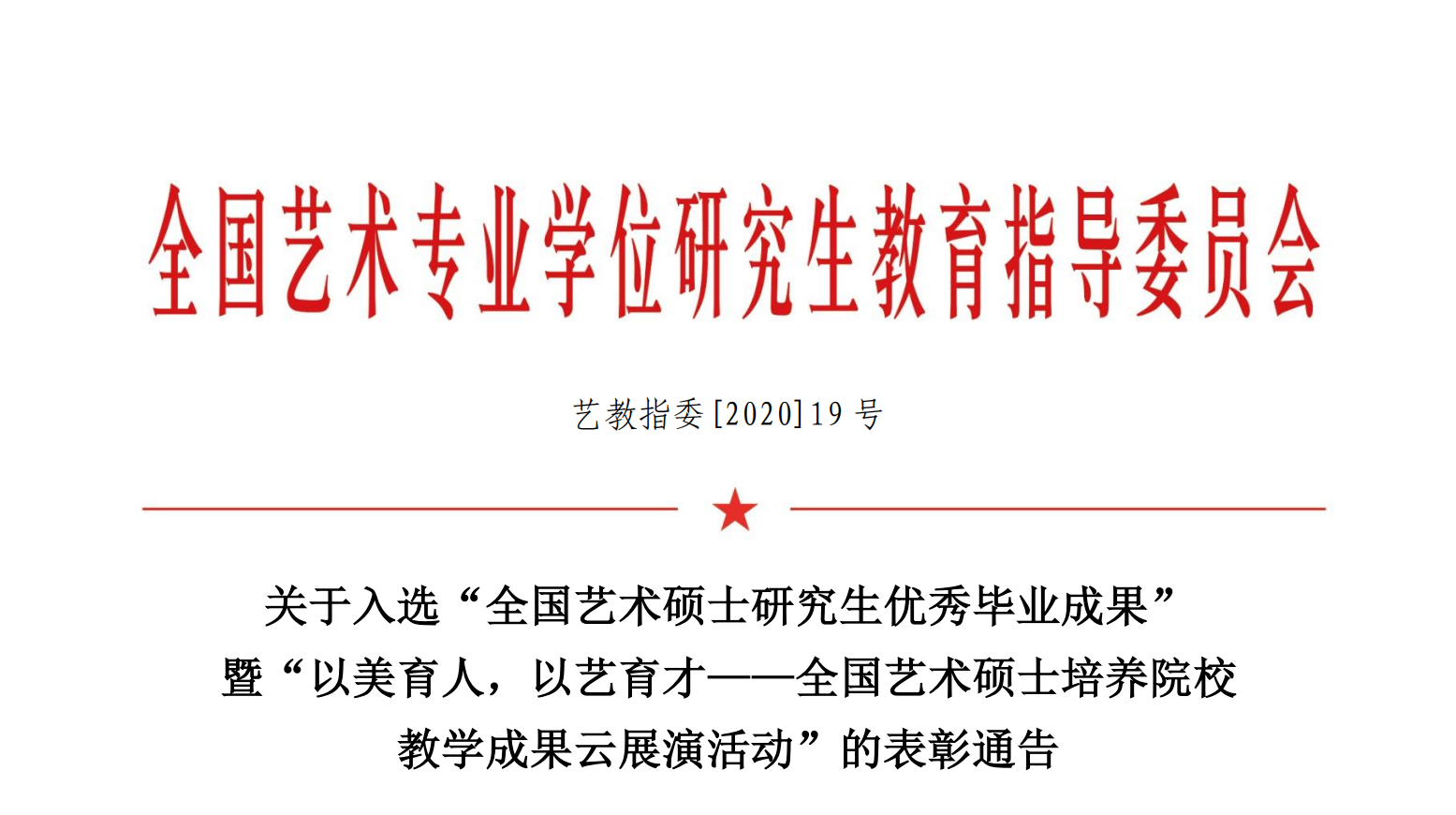 根据全国艺术专业学位研究生教育指导委员会《关于入选“全国艺术硕士研究生优秀毕业成果奖”暨“以美育人,以艺育才——全国艺术硕士培养院校教学成果云展演活动”的表彰通告》(艺教指委〔2020〕9号)通知,学院毕业生韩慧慧(导师杜如松)、张家蕾(导师朱楣)的毕业作品入选全国艺术硕士研究生优秀毕业成果暨“以美育人,以艺育才——全国艺术硕士培养院校教学成果云展演活动”(音乐领域),其中,韩慧慧毕业作品同时入选了优秀作品网络展播。