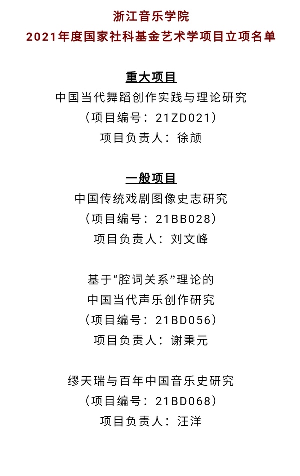 近日,全国艺术科学规划领导小组办公室公布2021年度国家社科基金艺术学项目立项名单,学院教师徐颃负责的“中国当代舞蹈创作实践与理论研究”获批重大项目,刘文峰负责的“中国传统戏剧图像史志研究”、谢秉元负责的“基于‘腔词关系’理论的中国当代声乐创作研究”和汪洋负责的“缪天瑞与百年中国音乐史研究”获批一般项目。