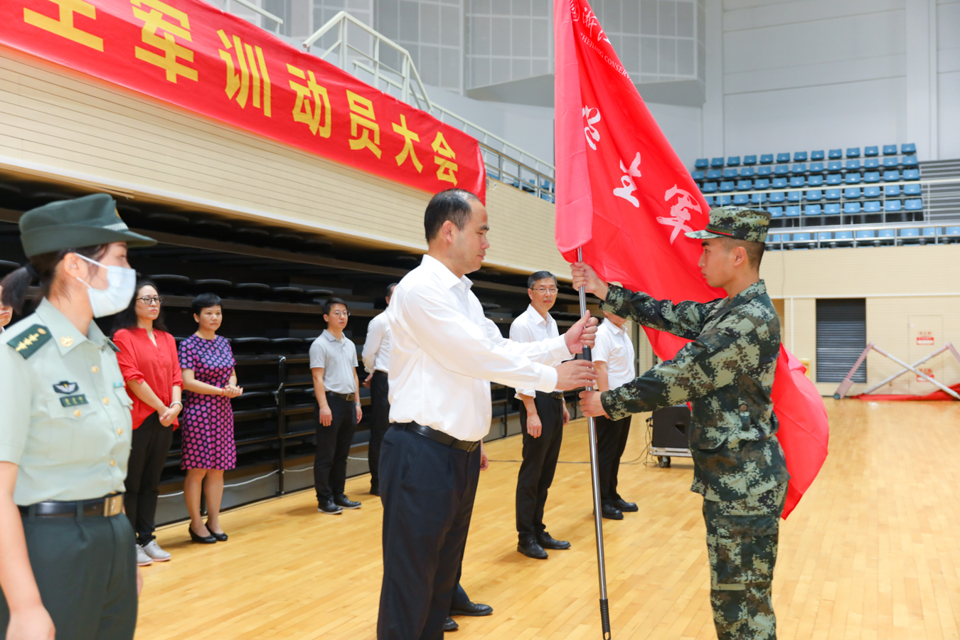大会上,杨九华宣布军训营干部任职名单。主席台领导向承训教官授军训营营旗。最后,樊彦利下达正式开训命令,为期两周的军训正式拉开帷幕。