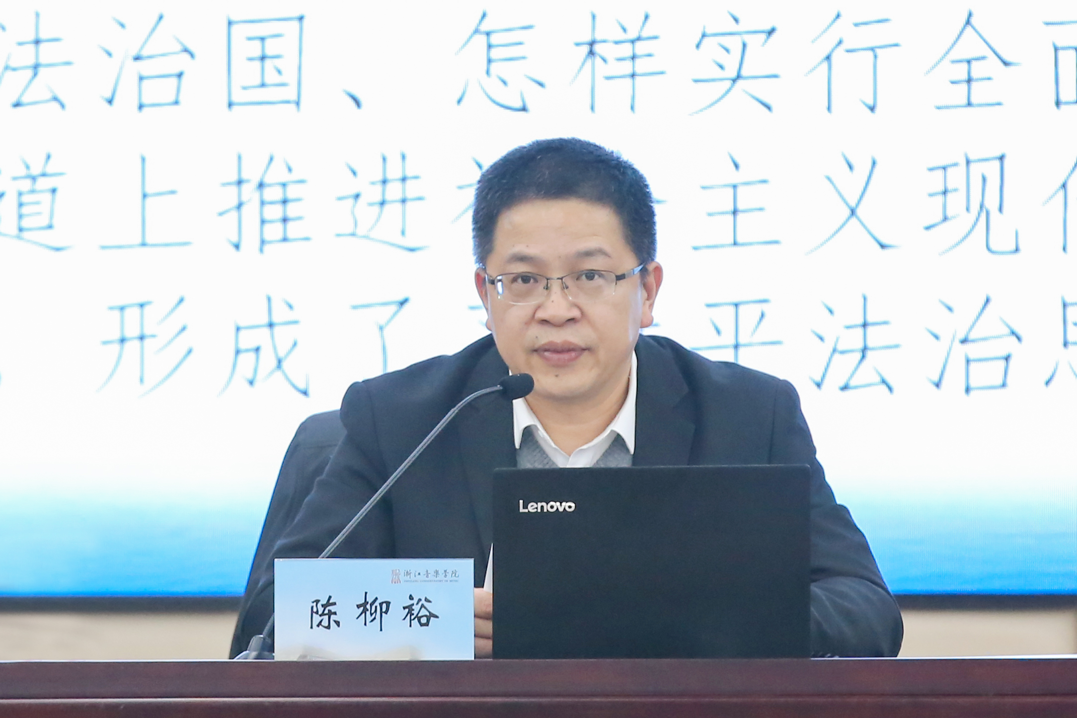 陈柳裕在报告中指出,习近平法治思想形成于中华民族伟大复兴处于关键时期和世界处于百年未有之大变局的历史背景,继承了马克思法治理论的思想精髓,赓续了中国共产党人在新民主主义革命时期、社会主义革命和推进社会主义建设时期、改革开放和社会主义现代化建设时期、开创中国特色社会主义新时代时期对于法治孜孜不倦的追求,标志着我们党对执政规律、社会主义建设规律、人类社会发展规律的认识达到了新高度。他从习近平法治思想的产生背景、形成过程、核心内容、个人解读四个方面阐述了习近平法治思想的基本精神,重点围绕习近平总书记法治思想的总要求及核心内容即“11个坚持”,深入解读了习近平法治思想的基本内容。他指出,习近平法治思想是对中国法治价值体系、理论体系、制度体系、话语体系全面系统的总结和凝练,关于全面依法治国的政治方向、工作布局、重点任务、重点保障等的论述,构成了习近平法治思想的核心内容。陈柳裕运用生动案例,辩证分析了政治与法治、党和法、改革和法治等关系,对学习理解、贯彻落实习近平法治思想分享了自己的体会。最后,他希望浙音师生能深入学习近平法治思想的重大意义、丰富内涵和实践要求,更加自觉地用习近平法治思想指导解决实际问题,坚定不移走中国特色社会主义法治道路,自觉做习近平法治思想的坚定信仰者、积极传播者、模范实践者。