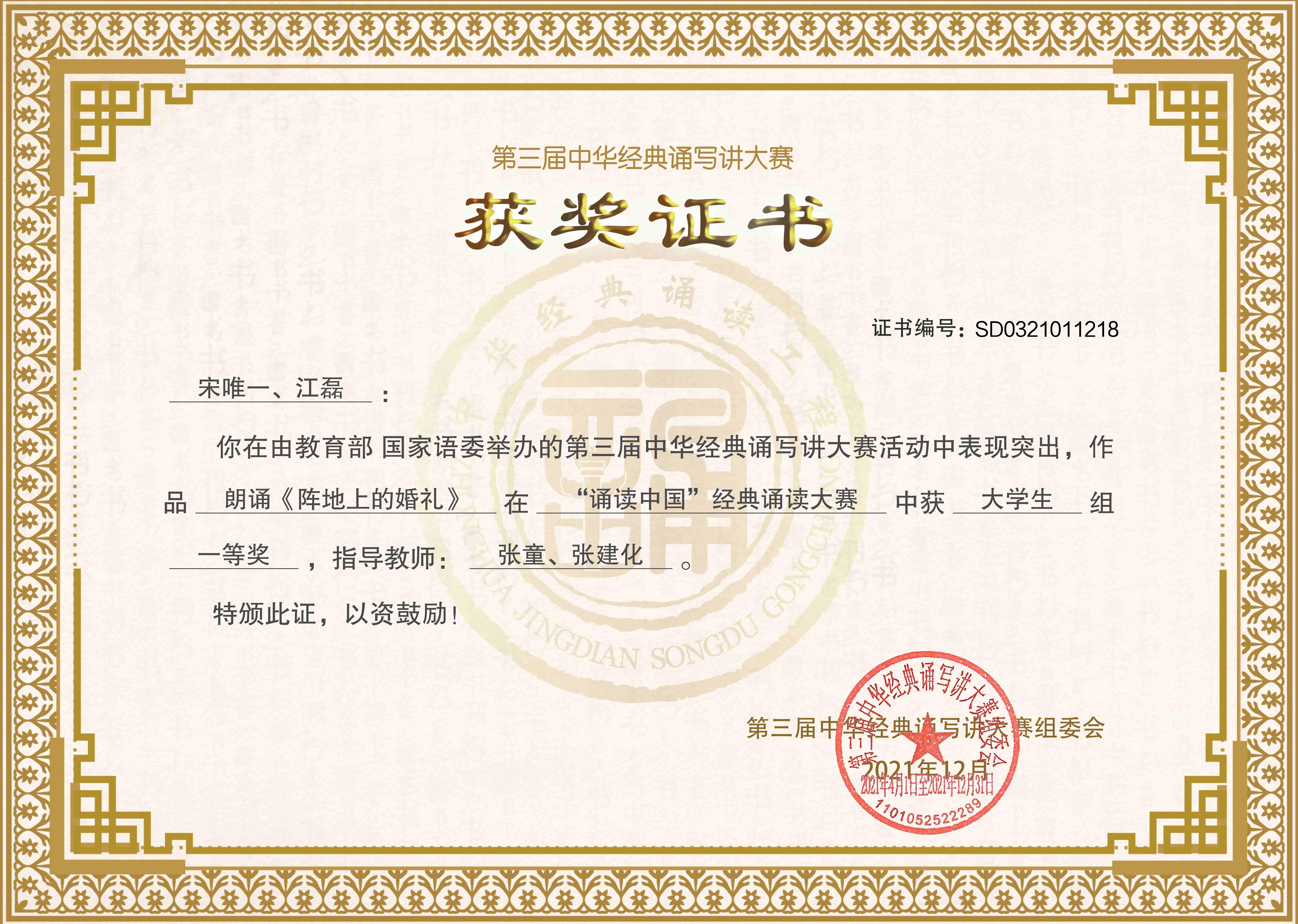 近日,教育部公布第三届中华诵写讲大赛获奖名单,学院声乐歌剧系学生宋唯一、江磊获得“诵读中国”经典诵读大赛大学生组全国一等奖,指导老师张童、张建化获得优秀指导教师奖。