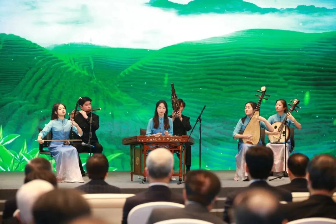 活动中,中日双方领导及嘉宾共同观看了两省县结好40周年宣传片,发布了40周年系列庆祝活动和企业合作协议,并互赠庆祝结好四十周年礼品。作为活动的重要组成部分,中日双方各表演一个文艺节目,以艺术的方式向对方表达最美好的祝愿。学院国乐系师生代表中方,为活动演奏了传统民族器乐重奏《采茶舞曲》,不仅展示了浙音师生的风采,更让中日观众感受到国乐丰富多姿的艺术魅力。演出由鲁芩(琵琶)、薛倩(中阮)、张络飞(竹笛)、王施宸(扬琴)、臧滢(二胡)和黎嘉亨(笙)6位师生共同演绎完成,国际交流合作处焦阳介绍乐曲,国乐系扬琴教师徐艺芳指导排练。庆祝活动前,钢琴系教师孙钧应邀进行了暖场演奏。