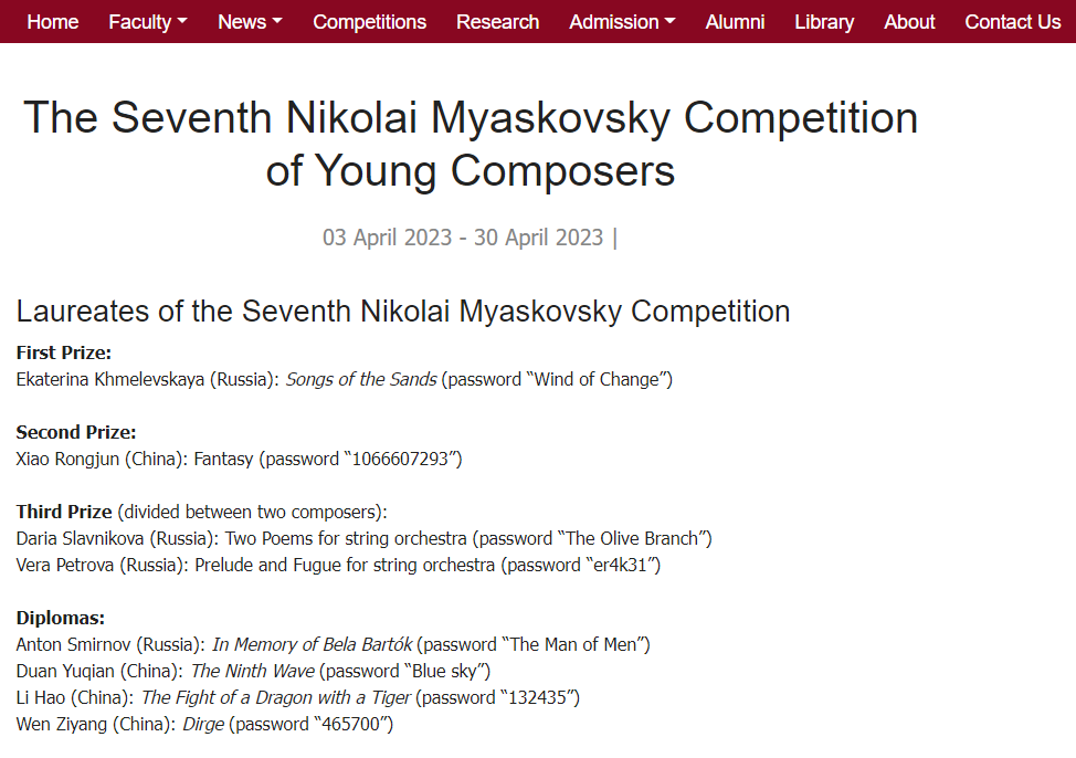 4月30日,第七届尼古拉·米亚科夫斯基青年作曲家国际比赛(International Nikolai MyaskovskyCompetition for Young Composers)在莫斯科国立柴可夫斯基音乐学院落下帷幕。作曲与指挥系本科四年级的肖荣俊(指导教师:郭鸣教授)凭借作品《Fantasy》(为弦乐队而作)获得本届比赛二等奖。
