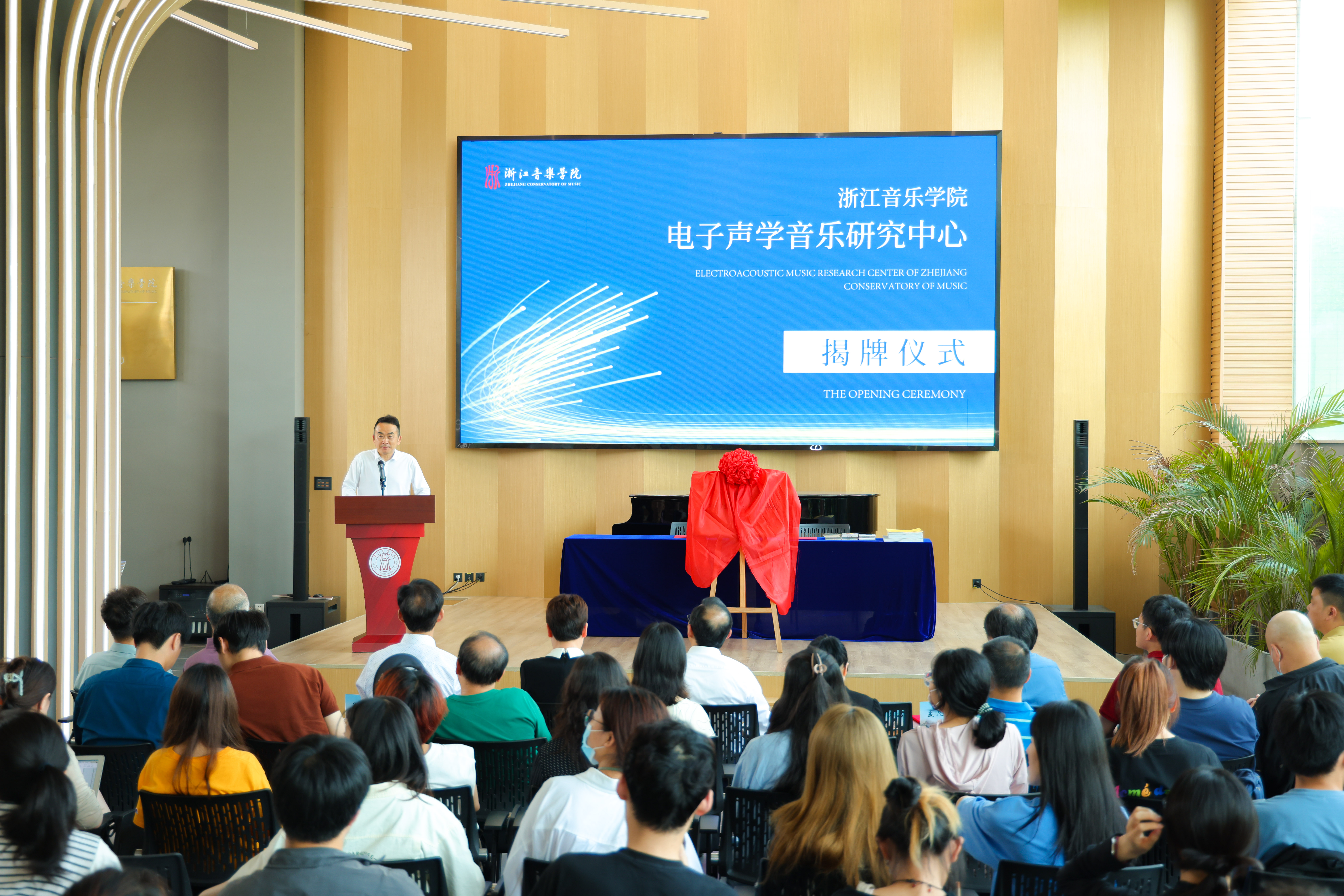 王瑞在致辞中向电子声学音乐研究中心的成立表示热烈祝贺。他表示,电子音乐、人工智能等技术与传统音乐创作的融合以及重要性已成为音乐界的普遍共识,电子声学音乐研究中心的建立,聚焦当下音乐创作和作曲专业教学,深化作曲教学改革,将电子音乐创作纳入作曲专业课程体系之中,努力解决中国作曲专业教学中对于现代创作技术及现代音乐语言应用不足的问题,推动中国当代作品的国际传播与交流,展现浙音作为成立于新时代的音乐学院开放、包容、多元、与时俱进的探索和发展观。他希望,中心在安承弼教授的带领下,立足浙江,服务全国,面向世界,依照当前国际前沿技术标准、设备标准和发展水平,引进一流人才,汇聚一流团队,打造一流平台,产出一流作品,建构浙音现代作曲课程与教学体系,促进浙音作曲学科、电子声学音乐研究领域的发展,将学院打造为中国乃至世界音乐创作及新音乐科技领域的高地。