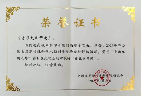 9月23日,在湖北宜昌召开的“全国高等学校文科学报研究会九届三次理事会会议”及“全国高等学校文科学报研究会成立35周年庆祝大会”会议上,全国高等学校文科学报研究会公布了“第七届高校社科学术期刊质量检查与评估结果”并举行颁奖仪式。我校《音乐文化研究》期刊作为“全国高等学校文科学报研究会”的新会员首次参加评选,期刊创办的“音乐丝绸之路研究”特色专栏荣获“全国高校社科期刊特色栏目奖”。