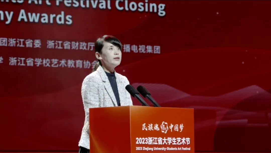 汤筱疏致闭幕词。她指出,美育是审美的教育,是心灵的教育。近年来,浙江省坚持以美育人、以文化人,让青年学子在动人的音符和斑斓的色彩中接受艺术的熏陶、思想的启迪和心灵的浸润,实现五育并举全面发展,为我省奋力推进“两个先行”,实施三个“一号工程”贡献美育的力量。她勉励青年大学生要努力争当美育初心的坚守者,热爱艺术、学习艺术、品味艺术、融入艺术,让艺术之美纯洁道德、丰富精神、滋养人生;要努力勇当美育价值的传播者,积极宣扬中华优秀传统文化和时代精神,用自身的艺术修为去影响人、感召人、引领人;要努力争当美育发展的开拓者,扎根中国大地、扎根时代生活,以大美之意汇传世之作,让美育之光在谱写中国式现代化浙江新篇章中熠熠生辉,光彩夺目。