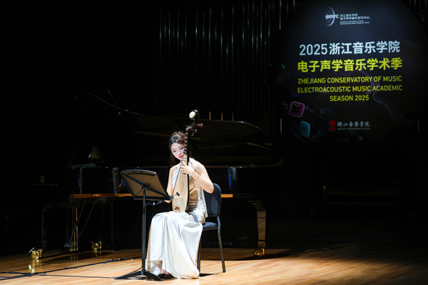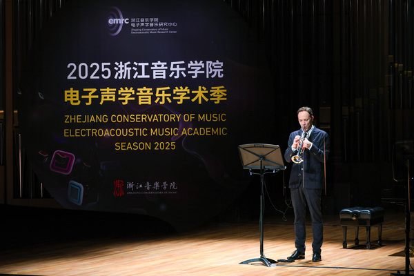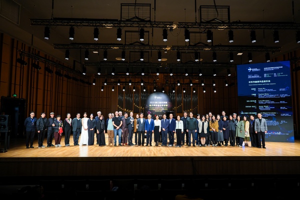 首场“中外作曲家作品音乐会”随即上演,共演绎了韩国作曲家吳藝敏、中国作曲家王甜甜、意大利作曲家拉拉·莫尔恰诺、中国作曲家艾尼瓦尔·瓦吉丁、法国作曲家何塞·米格尔·费尔南德斯,以及中国作曲家安承弼教授所创作的6部电子音乐作品:《迷人的耳鸣》为小提琴与电子音乐而作、《零维空间》为独奏小号与5.1环绕系统而作、《嵌入的缠结》为长笛与实时电子音响而作、《原野的细语》为琵琶独奏与电子音乐而作、《日晷》为小号与沉浸式实时电子音乐而作、《格调》为钢琴独奏和电子音乐而作。6部混合电子音乐作品生动描绘了技术与艺术交融的动人图景,为本次音乐学术季活动开启了精彩序幕。