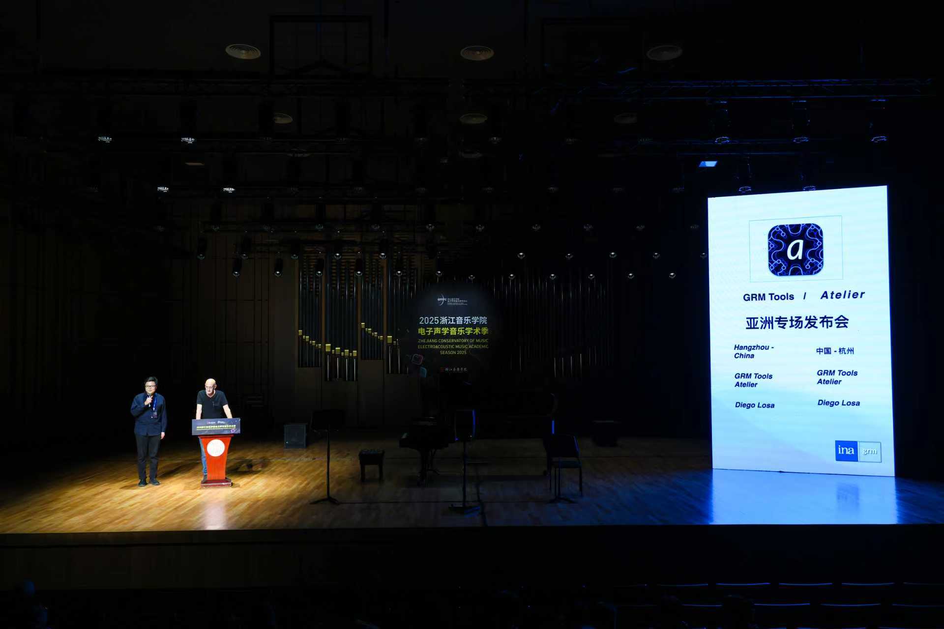 当天还举行了德国作曲家萨沙·杨科·德拉吉奇主讲的《Autogamie–系统与狂喜之间》专题讲座和迭戈·洛萨教授主讲的《GRM Tools Atelier》专题讲座。两场讲座核心在于展现一种介于高度理性的“体系”与直觉感官的“狂喜”之间的独特作曲思维,为学术季带来了深度的思想碰撞。